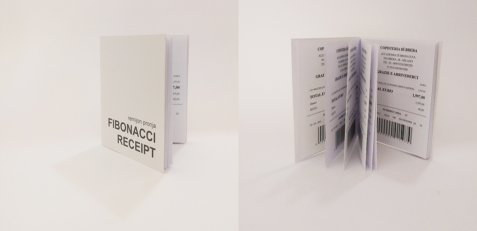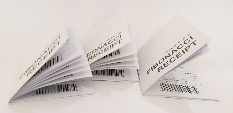 Is a little catalogue without any difference from page to page exept for the numeric value growing based on the Fibonnaci sequence. Leonardo Fibonacci builted a sequence where one number is the result of the sum of the two numbers before it. In fact the growing value of the book itself is in progress in every page. What happens with this book is in fact what happens with every article today, the progressive growth like a sequence of prizes of the very life value.